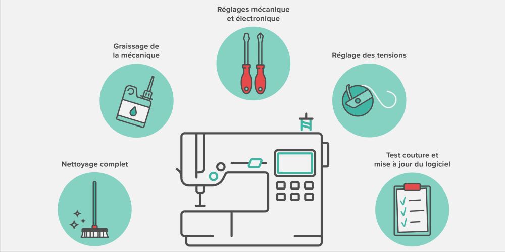 En tant qu’expert, nous allons plus loin dans le nettoyage et la vérification du bon fonctionnement de votre machine. Notre équipe est formée par les marques et en interne afin de connaître toutes les spécificités des machines. Nous retirons l’ensemble des capots de la machine, vérifions les différents engrenages, les réglages de la tension, du coupe-fil, de la réalisation du point et le bon fonctionnement de chaque pièce avec les outils et jauges de réglages fournis par les marques.